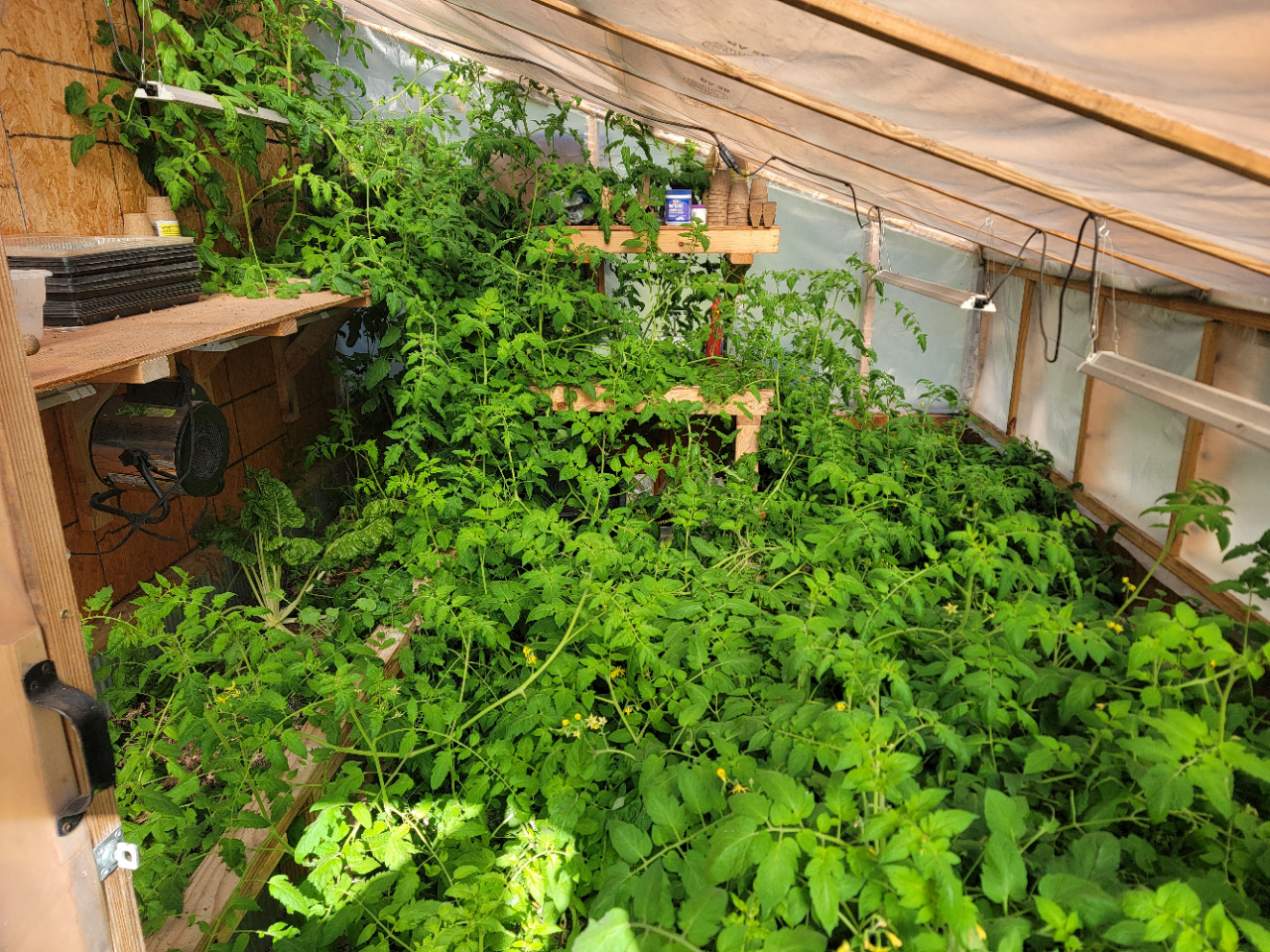 Yes, those are tomato vines that have literally taken over. There’s a walkway down the middle, shelves in the back, and an exhaust fan that’s completely covered. The thing is that I haven’t watered the entire time, and they still grew like weeds. The unfortunate part is that there were very few tomatoes as a result.